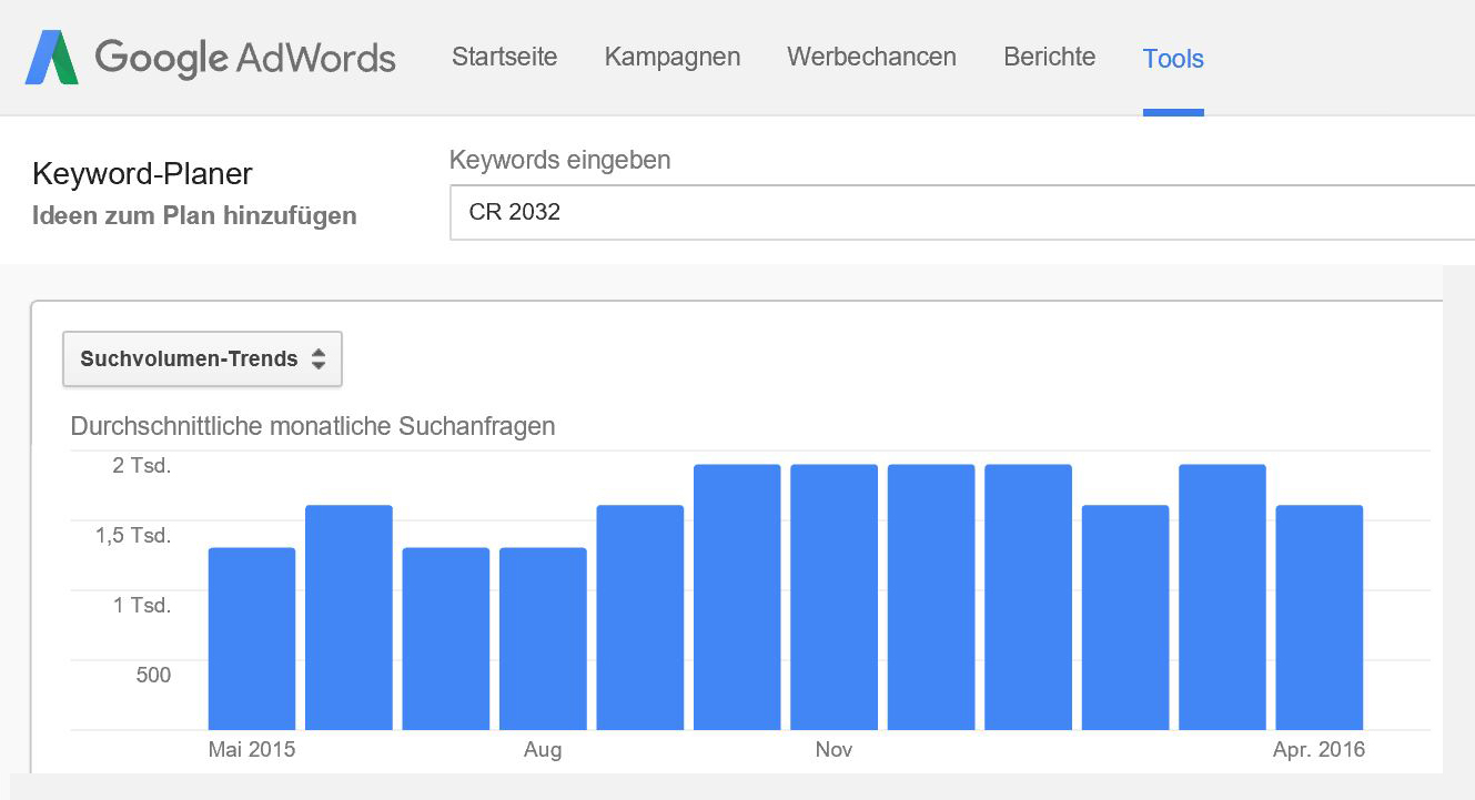 - Wie kommen Sie an die Kunden? Sehr einfach. Bei Google suchen fast 2000 Menschen nach „CR 2032“, jeden einzelnen Monat sehr konstant. Das zeigt der „Google Keyword Planner“