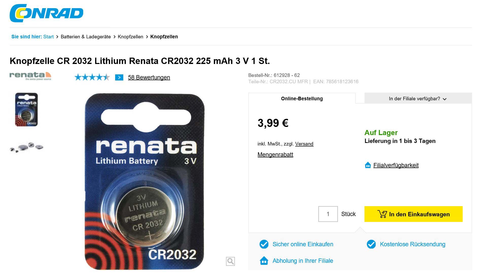 - Das Produkt wird für 3,99 € verkauft, beispielsweise derzeit auf conrad.de